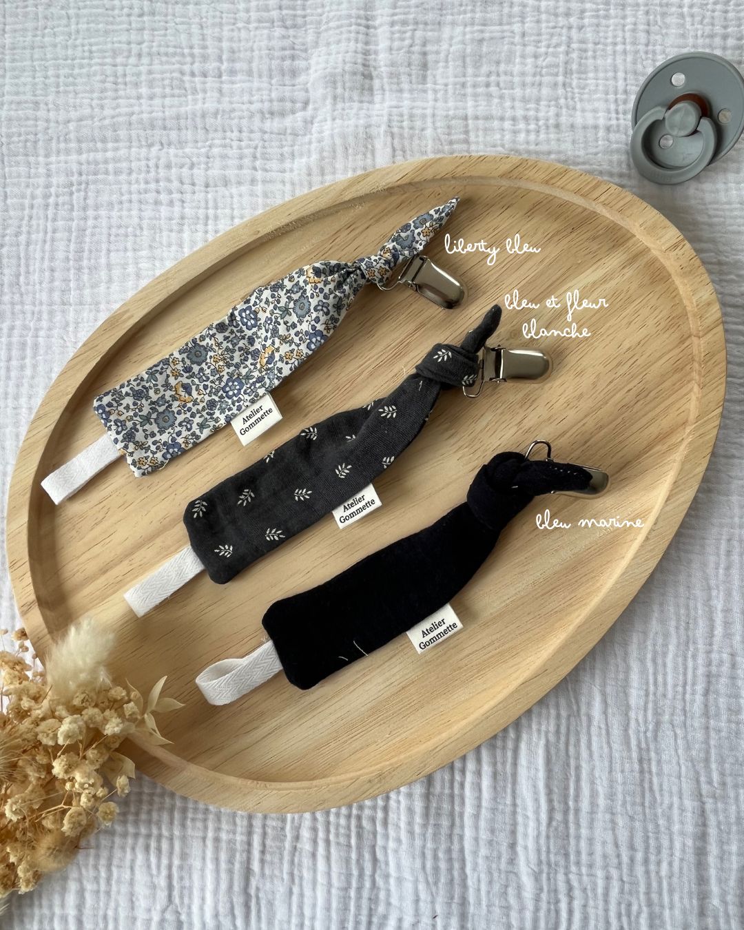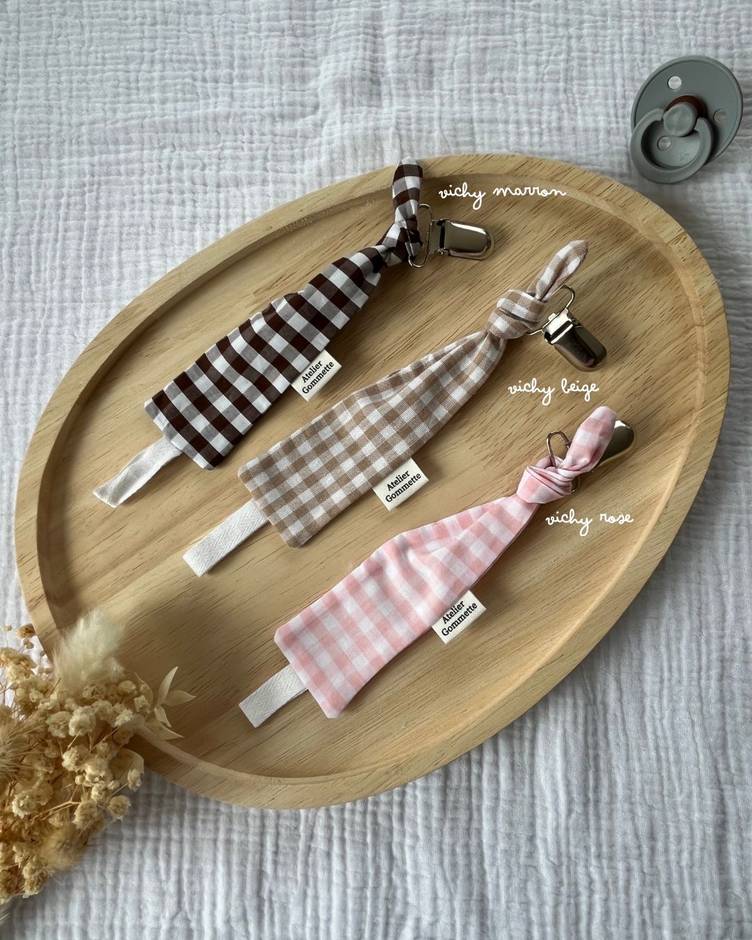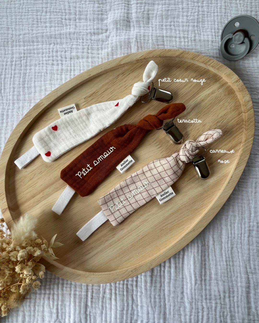 Joli attache tétine en coton et gaze de coton.